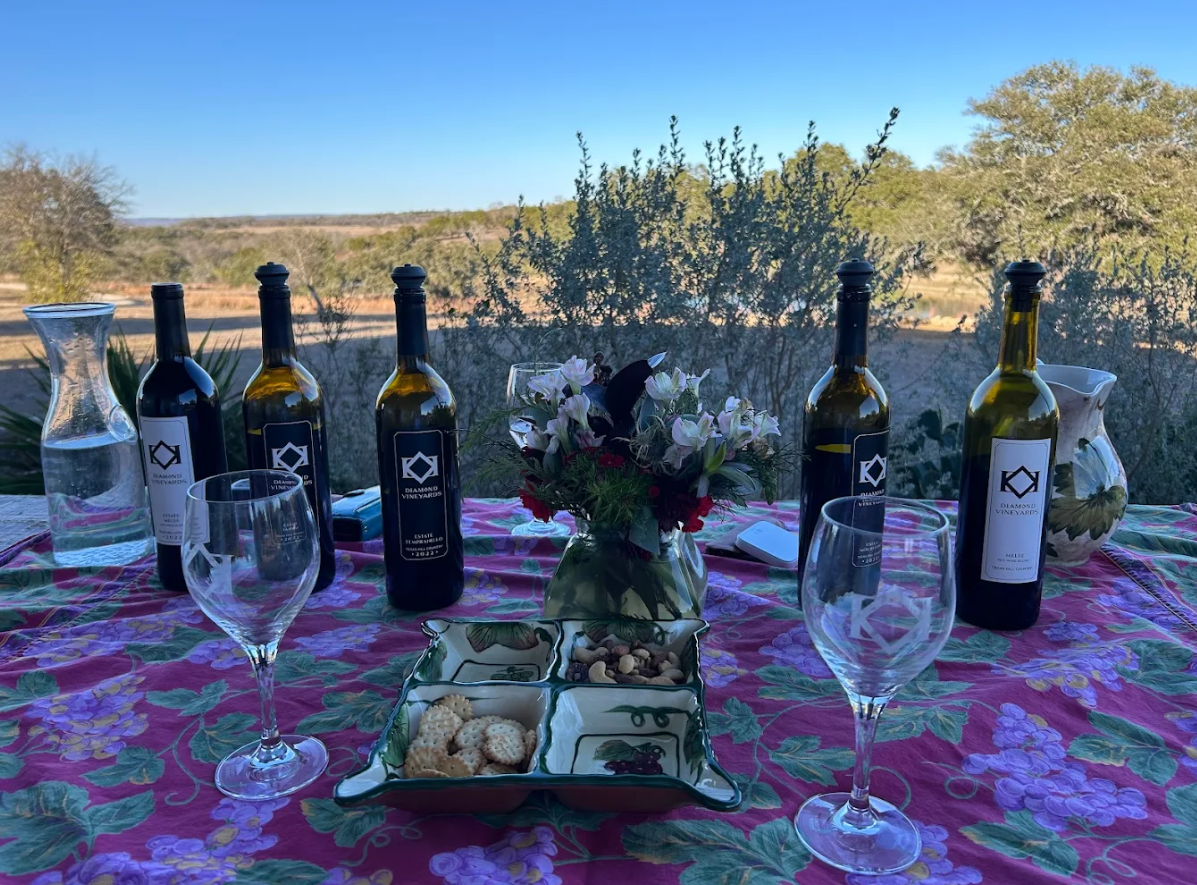 Diamond Vineyards is part of Diamond in the Rough Ranch, a 100-acre ranch that includes a wildlife preserve and 15 acres of Hill Country AVA/Fredericksburg AVA grapes. The vineyards were planted between 2018 and 2022. With each harvest, they expand their wine offerings providing high quality Tempranillo, Tannat, and Mourvèdre to Hill Country Wineries. Diamond Vineyards routinely hosts groups and individuals for farm to table lunches, private dinners, vineyard hikes and more. -World-traveled, professionally trained sommelier who also cultivates these very vines -Discover the nuances of our terroir and the meticulous practices behind our wines. -Immersive experiences offer unique opportunities to gain firsthand knowledge of both the art of agriculture directly from the source